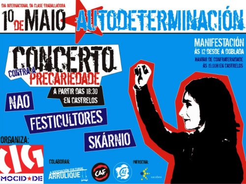 O Concerto reivindicativo contra a Precariedade contará coas actuacións dos grupos Nao, Festicultores Troupe e Skárnio, que actuarán a partir das 18.30 no Parque de Castrelos.