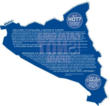 Militantes da Joventut Nacionalista de Catalunya (JNC), organización xuvenil de Convergència Democràtica de Catalunya (CDC), comezaron a repartir este sábado, entre os turistas que entran en coche dende o Estado francés pola fronteira de La Jonquera (Girona), uns abanos de cartón coa silueta de Cataluña e co lema Catalonia is not Spain. This is Catalonia! (Cataluña non é España. Isto é Cataluña!).