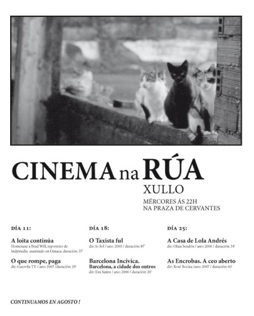 O Cineclube de Compostela, logo da súa macrofesta pola cultura libre, aínda continúa no verán. Cambia o emprazamento habitual, no local da Gentalha do Pichel, para a Praza de Cervantes. Xunto coa Casa Encantada, teñen preparado un ciclo de cinema para os mércores de xullo e agosto. Polo de agora, xa teñen un programa para este mes: as proxeccións serán na Praza ás dez da noite (en agosto trasladaranse ao Barrio de San Pedro - Almáciga), e comezan este día 11.