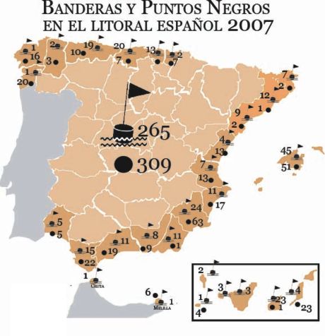 Os ecoloxistas puxeron 265 bandeiras negras e marcaron 309 puntos negros por todo o Estado; e moitas delas van alén de Marbella ou da costa do Sol, e chegan a varios municipios galegos.