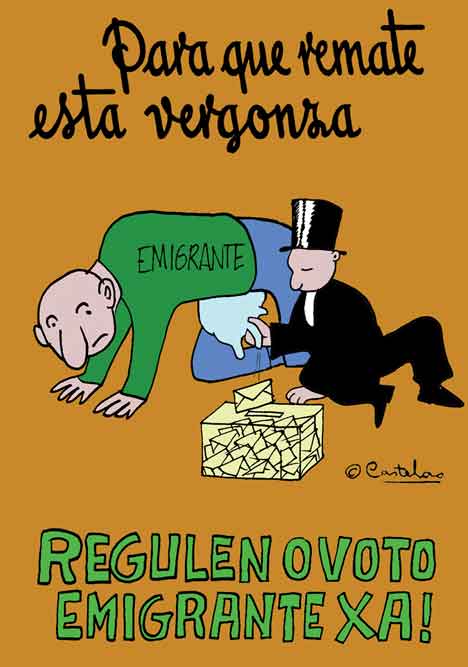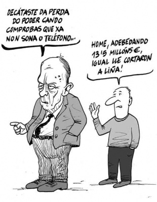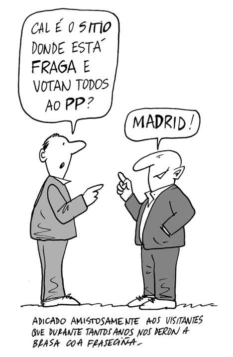 Isto é coma noutros ámbitos, ás veces hai nomes máis consolidados polo que sexa, pola súa calidade gráfica ou porque foron apadriñados no momento xusto nas publicacións máis difundidas. Pero na prensa galega está todo moi medido, sobre todo na que máis vende, e no humor tamén. Non é o mesmo o Fraga paternal e con gaita de Siro, que o Fraga de Xosé Lois, ou, modestamente, dos que teña debuxado eu. Ou o Fraga cadavérico de Pepe Carreiro, quen por certo tivo que marchar da Voz no seu día por certas censuras. E non só é que se di senón de que se fala, ou de que non se fala nunca. Os chistes son columnas de opinión de lectura rápida e ás veces de impacto máis profundo ca un longo artigo. Polo tanto están igual de controlados que o resto das informacións, e igual de ideoloxizados. E cada quen se sitúa onde quere, ou onde lle deixan, á marxe da calidade gráfica e de talento de cada un. Eu, e outros, polo menos digo o que quero, a costa de non recibir nada, nin de chegar máis que a unha minoría.