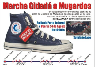 Serán 17 quilómetros a pé. A saída: o vindeiro venres 24 ás 16 horas desde o peirao ferrolán. O obxectivo: achegárense até a casa do Concello mugardés, onde para daquela se terá cumprido xa un mes desde que os veciños iniciaran o peche en protesta pola ameaza da planta de gas á beira das súas vivendas. Contra a noite o Comité Cidadán poñerá buses para que os participantes na marcha poidan volver a Ferrol.