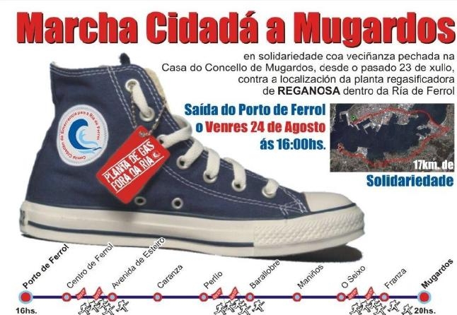 A marcha a pé en solidariedade cos veciños contrarios ao Plan de Emerxencia Exterior de Reganosa, encerrados dende hai un mes na casa do Concello de Mugardos, concentrou este venres un importante número de persoas ao seu inicio, no porto ferrolán de Curuxeiras, entre as que se atopaba a primeira tenente de alcalde de Ferrol, Iolanda Díaz.