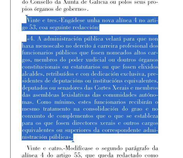Así o fixa o 23º punto da reforma da Lei de Función Pública, unha engádega que amplía o artigo 53 da vella norma e que estende o alcance de, por exemplo, a disposición adicional 17ª, aumentando o desembolso previsto para os petos dos cidadáns. Unha cláusula presuntamente estabelecida para que "non haxa menoscabo no dereito á carreira profesional dosfuncionarios públicos que fosen nomeados altos cargos, membros do poder xudicial ou doutros órganos".