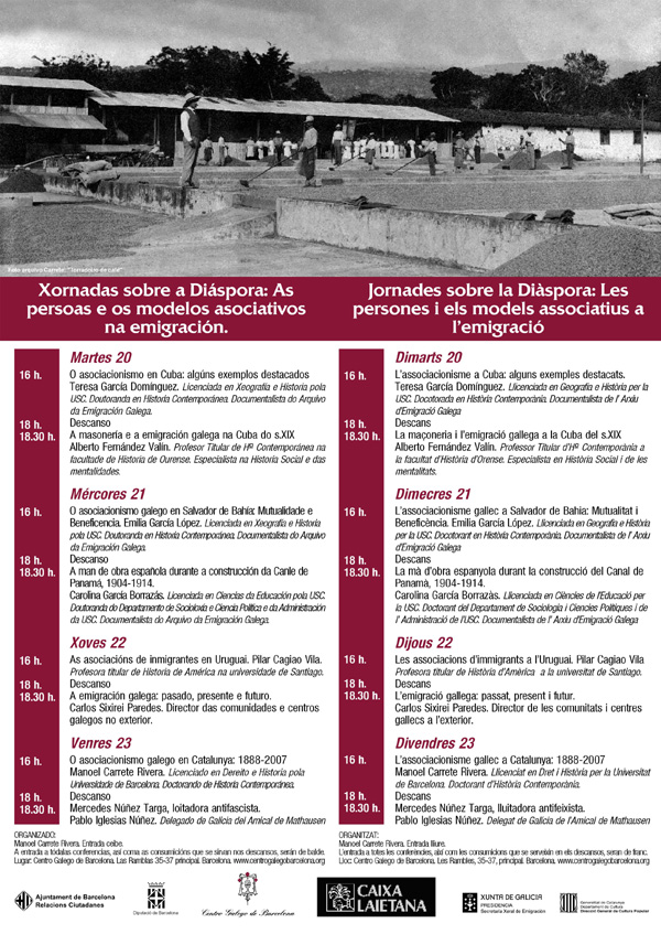 16:00 h: "O asociacionismo galego en Catalunya: 1888-2007". Manoel Carrete Rivera (Licenciado en Dereito e Historia pola UB)