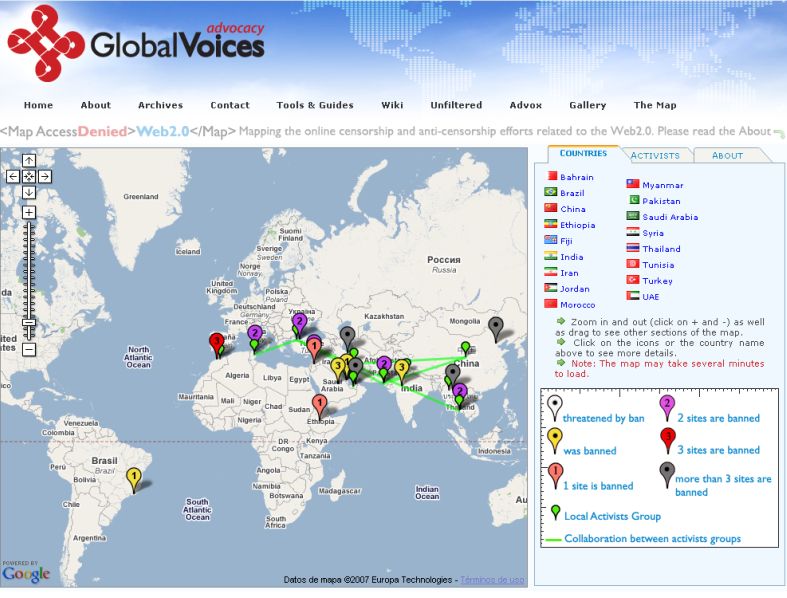 Global Voices Online, un foro no que participan blogueiros de todo o mundo, acaba de publicar un mapa interactivo que recolle os países que practican a censura na rede, a xeito de denuncia e para facer de voceiros de moitas campañas locais que defenden o acceso libre á Web 2.0.