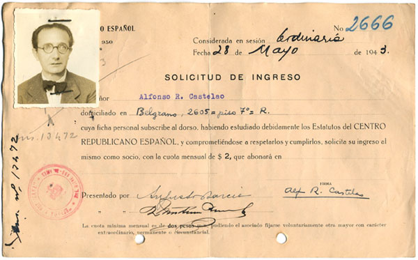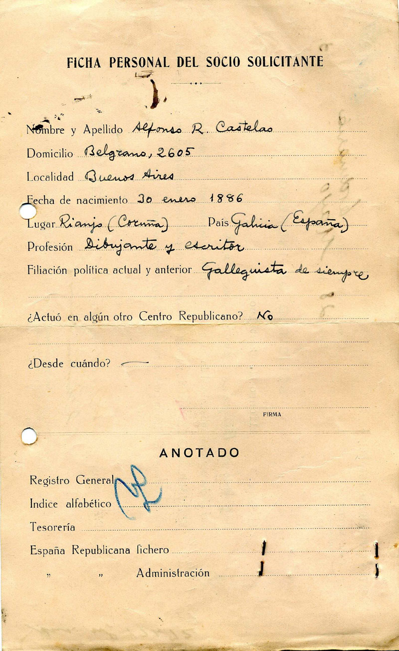 Na solicitude, Castelao escribiu, da súa man, o seu nome, enderezo na cidade arxentina, data de nacemento (en "Rianjo", Coruña) e filiación política actual e anterior, cadriño ben completo, que o político galego encheu, cunha letra das da xente de antes, coas verbas "Galeguista de sempre".