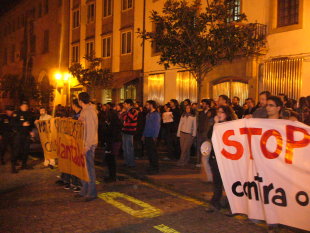 Ao redor de trescentos estudantes responderon ao chamamento que o venres ao mediodía fixeran varias organizacións para protestar polas detencións de Serxio Piñeiro e Iago Barros. A concentración partiu da praza de Cervantes e encamiñouse ás dependencias da policía nacional en Compostela, onde se despregaron dúas faixas nas que se podía ler "non á criminalización do estudantado" e "stop represión contra o estudantado". Tamén repetiron berros pedindo a liberdade dos detidos, e criticando a actuación policial e do reitorado da USC. A presenza dos medios de comunicación era moi numerosa, con media ducia de cámaras de televisión que gravaron a manifestación ao completo.