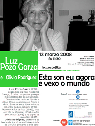 A académica da RAG e a escritora Luz Pozo Garza participan no I Congreso Escritores-Profesores que, en homenaxe ao poeta Antonio Machado, se celebra nas cidades que marcan o itinerario vital do poeta. Durante a súa estadía en Barcelona ofrecerá unha lectura poética da súa obra na UB, presentada por Olivia Rodríguez, profesora de teoría da literatura na Universidade da Coruña. O acto, organizado por Filologies Gallega i Portuguesa e mais o Centre Dona i Literatura, será presentado por Basilio Losada, amigo persoal da escritora, ademais de antólogo dalgúns dos seus poemas para edicións españolas de poesía galega contemporánea.