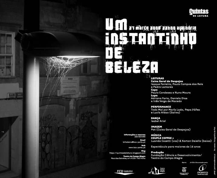 Um instantinho de beleza é un verso de Alexandre O´Neill, ao redor do que se organizou un megarecital de poesía no Porto. Forma parte do ciclo Quintas de Leitura, que se vén desenvolvendo todos os xoves no Auditorio do Teatro do Campo Alegre. Comezará ás dez da noite, e nel participarán tres colectivos poéticos: Caixa Geral de Despojos (Isaque Ferreira, Pedro Lamares e Paulo Campos dos Reis), Copo (Nuno Moura e Paulo Condessa) e Lupa (Adriana Faria, Daniela Dias e Inês Veiga de Macedo). Entre todos farán un repaso da poesía portuguesa das últimas décadas, deténdose por exemplo en António José Forte, Daniel Filipe, Luíz Pacheco, Fernando Assis Pacheco, Mário Cesariny, Adília Lopes, António Gancho, e Jorge Sousa Braga.