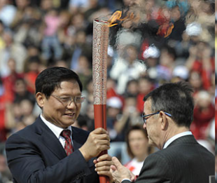 Durante unha cerimonia en Atenas, de mans do presidente do Comité Olímpico de Grecia, Minos Kyriakou, o facho olímpico pasou este domingo ao representante da organización olímpica en Beixín. Logo da viaxe aérea até China, e despois dunha festa na Praza de Tiananmen onde a última hora parece que se permitirá o acceso dalgúns xornalistas estranxeiros, o facho inicia o relevo "mundial" que incluirá o paso por múltiples países nun percorrido de case 140 mil quilómetros até que chegue o próximo 8 de agosto á cerimonia de inauguración dos Xogos.