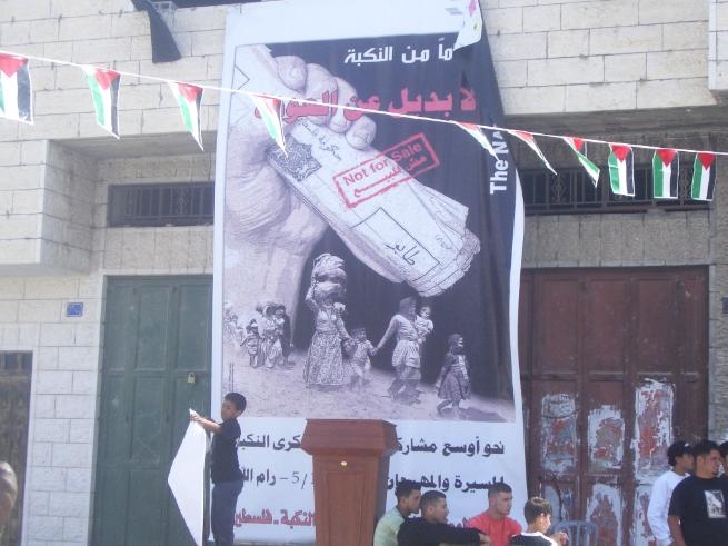 Os actos de protesta empezaron de distinta maneira en Palestina. En Ramallah preparouse un lugar, con tendas de campaña, coma unha especie de museo no que amosar fotos, conferencias e experiencias de refuxiados e apátridas. Noutras cidades houbo xuntanzas, acompañadas de charlas e izadas de bandeiras. E en todas elas coincidiu o símbolo da Nakba: a chave. Unha chave, moitas veces real, que representa a única peza herdada dun longo período ateigado de ferrollos.