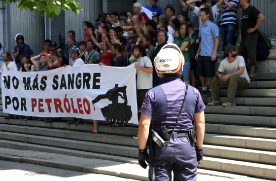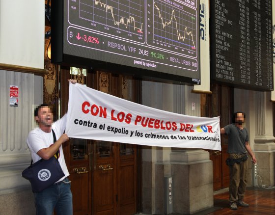 Un cento de persoas da plataforma Rompamos el Silencio entraron, na mañá da segunda feira, no edificio da Bolsa, en Madrid, para protestar pola participación da cidade no XIX Congreso Internacional do Petróleo, que acolle até a vindeira quinta feira.