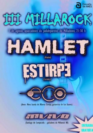 A terceira edición do Millarock contará este ano coa participación dos metaleiros madrileños Hamlet, os cordobeses Estirpe, Eco -a banda de Alberto Cereijo e Tino de Los Suaves, e máis os santiagueses Invivo. Invivo resultaron vencedores do concurso que organiza o concello de Ames para facer promoción dos aos novos grupos.