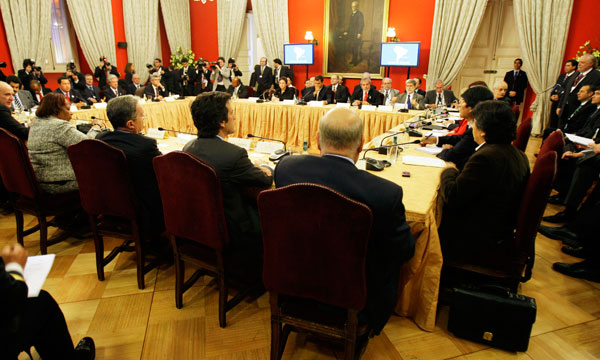 Logo de seis horas de debates cos gobernantes de Arxentina, Brasil, Bolivia, Ecuador, Uruguai, Paraguai, Venezuela e o ministro de Exteriores de Perú, a presidenta de Chile, Michelle Bachelet, leu ante os medios a declaración subscrita por todos os mandatarios no Palacio da Moeda.