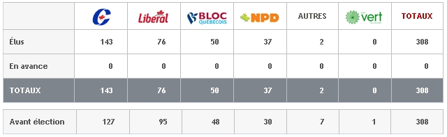 O Partido Conservador do primeiro ministro canadense, Stephen Harper, logrou a vitoria nas eleccións ao parlamento federal, obtendo 143 deputados, mais fica lonxe da maioría, situada nos 155 escanos.