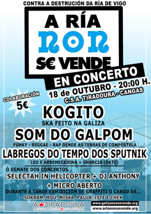 O Centro Social A Tiradoura acolle, a partir das oito da tarde do sábado, o concerto A Ría non se Vende, no que participarán Kogito, Som do Galpom e Labregos do tempo dos Sputnik, o dúo formado por Leo i Arremecaghona e García de DKTC. Pódese colaborar co colectivo cunha achega de cinco euros na entrada.