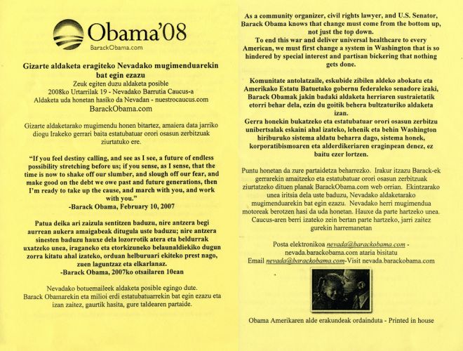 Nevada é un dos Estados norteamericanos con maior número de habitantes de orixe vasca, xunto a California e Idaho, cousa que se coñece que sabían os asesores do candidato demócrata á presidencia dos EUA, Barack Obama. Durante a campaña o Comité de Apoio a Obama de Nevada lembrou os vascos, e repartiu varios pasquíns coa propaganda electoral traducida ao éuscaro.
