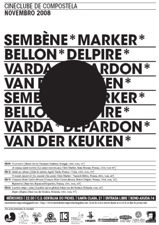 O Cineclube de Compostela continúa a súa programación este novembro e decembro cunha oferta moi variada na que terán un peso especial os fotógrafos, detrás e diante das cámaras. Chris Marker, Agnès Varda, Henri Cartier-Bresson, Raymond Depardon, Johan Van der Keuken... son algúns dos nomes relacionados co mundo da fotografía que estarán representados no programa destes meses. A programación, ademais, abrese cunha sesión dedicada á descolonización africana (con O Carreteiro de Ousmane Sembène e As estatuas tamén morren de Marker e Resnais) e pecha con dúas sesións sobre a memoria política dos que non están (Morrer aos trinta anos de Romain Goupil e Os loiros, de Albertina Carri), antes de interrumpir a programación até a volta das festas de inverno.