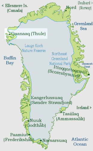 Os Estados Unidos contan cunha base aérea en Grenlandia, concretamente en Oaanaaq (ou Thule), de grande importancia estratéxica durante a Guerra Fría polo medo a que a URSS atacase dende o Polo Norte. A base estaba equipada cun potente radar e con armas nucleares listas para atacar Moscova.