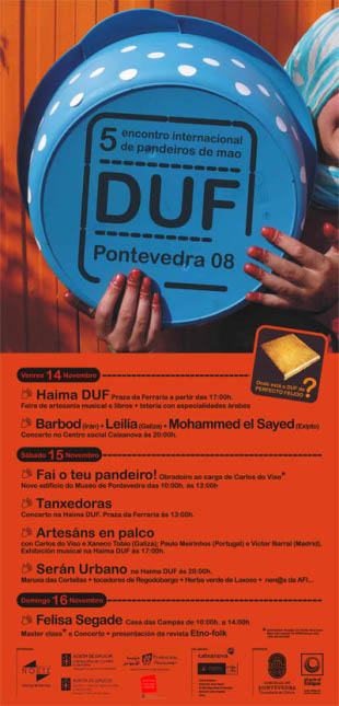 O Centro Galego de Música Popular deseñou este festival DUF, verba de orixe árabe -presente xa nas cantigas medievais- da que derivou adufe, nome co que tamén se denomina ao pandeiro. DUF vai dirixido a todos os públicos sen descoidar a programación de actividades para investigadores e músicos -master class, exposición do adufe histórico de Perfecto Feijoo, presentación edición monográfica de Etnofolk sobre os pandeiros de mao...