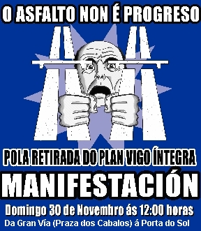 Un milleiro de persoas manifestáronse este mediodía polas rúas de Vigo para esixir a "retirada inmediata" do Plan Vigo Íntegra, ao que acusaron de pretender "asfaltar máis de sete millóns de metros cadrados" da paisaxe galega. Segundo recollía o manifesto que leu o portavoz dos colectivos, Xosé Reigosa, ao final da concentración, o Plan Vigo Íntegra "terminaría para sempre coa vida no rural galego" ao "romper a súa conexión coa terra, expropiar casas, montes e terras en nome dun progreso que non é tal".