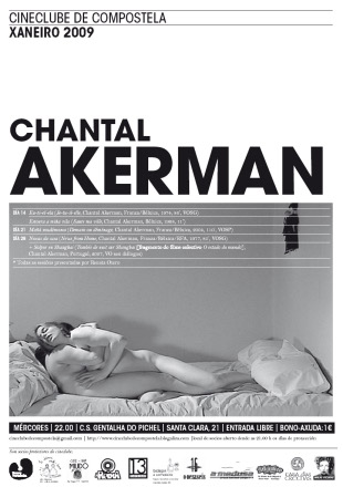 O Cineclube de Compostela inicia o 2009 cun mes de xaneiro dedicado en exclusiva á realizadora Chantal Akerman. A mostra recolle desde o primeiro filme da directora, Estoura a miña vila, de 1968, até o segmento Solpor en Shanghai, o último feito pola directora, realizado para o filme O estado do mundo, de 2007. Todas as sesións, ademais, van ser introducidas por Renata Otero, que realiza na actualidade a súa tese sobre Akerman. As proxeccións, como todos os meses, serán todos os mércores a partir do día 14, ás 22:00 horas da noite, no Centro Social O Pichel (Santa Clara, 21).