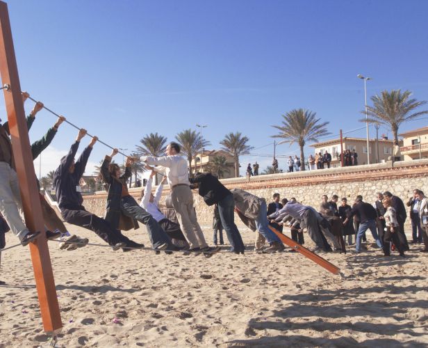 Prometeo é froito dun traballo dun grupo de deseñadores e enxeñeiros -entre eles Antonio Maceiras, o pai dun todoterreo que supera en prestacións do famoso hummer norteamericano-, mais tamén de artistas, porque é unha peza que até estivo exposta no Marco de Vigo. E ademais, gústalles aos pequenos: "os usuarios descobren o uso que lle queren dar. Xa nun primeiro momento, ao observalo no espazo público, o ollo percibe a tensión dos cables movidos polo vento, e a persoa vai pensando como empregalo. Unha vez enriba, comeza o xogo para conseguir o movemento, vén o vertixe, parece que a peza vence co peso... dá moito xogo e resulta emocionante para quen o proba. Semella un veleiro, a emerxer da terra, xa que ten elementos náuticos coma o mastro e as cordas".