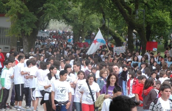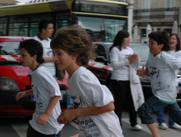 Compostela encheuse este xoves de mozos, mozas, nenas e nenos que se xuntaron para reivindicar no medio dun ambiente xovial e usando como medio a festa rachada o seu dereito a medrar en galego. Máis de 4.500 mozos e mozas chegados de concellos pertencentes ás comarcas colindantes participaron no Correlingua´09, xornada que tivo carreiras, concertos, humor e, sobre todo, moita troula baixo o lema En Galego! Pásao.