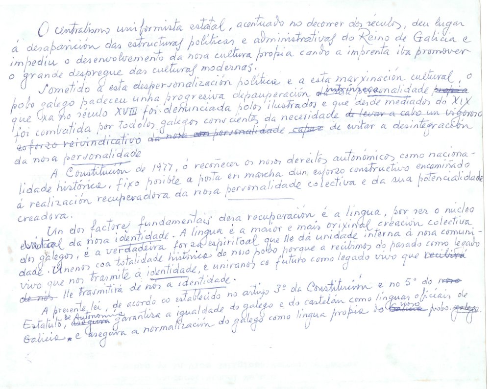 Publicamos o texto manuscrito do preámbulo da lei aprobada por unanimidade en 1983, redactado por Piñeiro e Casares.
