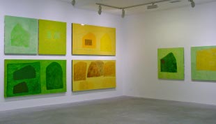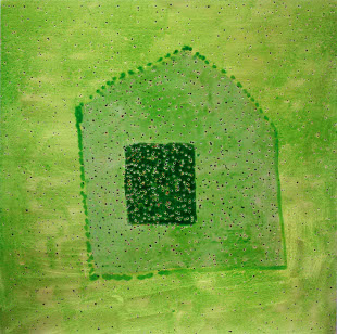 A mostra está formada por 34 pezas de cartón nas que constrúe paisaxes salpicadas con peculiares construcións, perfiladas, perforadas. Paisaxes nas que o verde é a cor central, cuberto por capas e capas de verniz que homoxeinizan a superficie e crean esa atmosfera tan particular das obras de Lamazares. Atmosferas, cores e paisaxes que nos traen á memoria series anteriores como Bes de Santa Baia ou Eidos de Rosalía. Unha vez máis Lamazares toma a paisaxe galega como punto de partida para crear o seu particular iconografía.