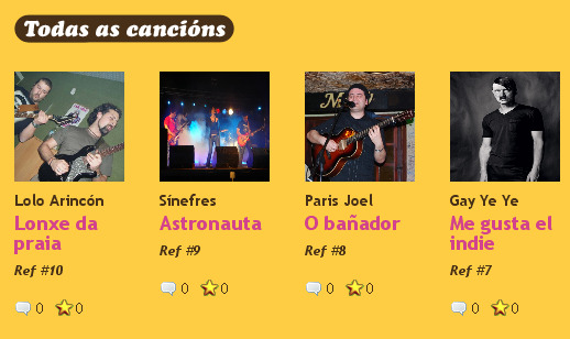 O cuarto tema chegado esta semana, que fai que xa sexan unha decena os que entraron a concurso, é Me gusta el indie, de Gay Ye Ye. Trátase dunha canción contra a ditadura da música comercial e do indiepop, que o propio Gay Ye Ye viviu nas súas carnes propias cando percorreu os festivais do país o verán pasado, e acabou sumido nunha profunda depresión, ao ollar que a "artificial melancolía" deste tipo de música "colonizaba os mellores encontros musicais", desprazando a tralla "que enchía o estío de forza e ganas de gozar".