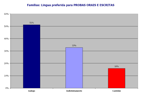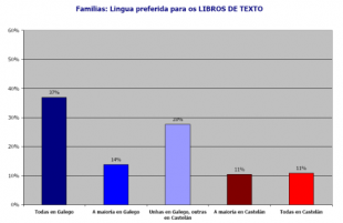 Cales son as preferencias lingüísticas dos pais que respostaron á enquisa da Consellaría de Educación? En Santa Comba sábeno. O Equipo de Normalización e a dirección do IES “Terra de Xallas” organizaron un cuestionario paralelo. Os pais de alumnos de cursos comprendidos entre primeiro da ESO e primeiro de Bacharelato tamén contestaron ás preguntas do centro. O resultado foi o seguinte: O 48% dos titores prefire que todas as materias troncais se impartan en galego; o 9% que haxa máis en galego ca en castelán; un 24% que as materias troncais se dividan entre as dúas linguas; un 9% que a maioría se impartan en castelán; e outro 9% que todas as troncais sexan en castelán.