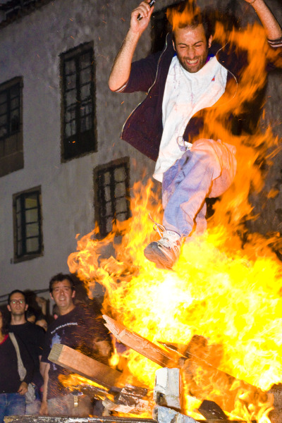 Na imaxe, un intrépido saltador de fogueiras asoma por riba do lume, na praciña da Algalia, en Compostela. A carón había unha outra fogueira, ben máis pequena, que saltaban os miúdos e aqueles que lle tiñan medo á grande.