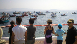 Tanto o patrón maior cangués como o resto da directiva das outras Federacións compareceron en conferencia de prensa despois de que un cento de embarcacións de pesca de baixura percorresen a ría de Vigo e se concentrasen fronte á conserveira simulando o perímetro dos recheos previstos no proxecto de Mariña Atlántica para o Porto Deportivo.
