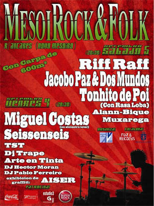 Novo Mesoiro estrea festival. O barrio coruñés que mudou en poucos anos o seu aspecto rural para converterse nunha zona urbanizada e moi populosa, acolle o 4 e o 5 de setembro a primeira edición do Mesoiroc&Folk. Grupos galegos de rock, folk, hip hop e música electrónica forman o cartel dun certame que inclúe tamén un concurso de maquetas para grupos locais.
