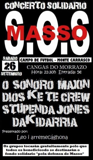 Á protesta contra a construción do porto deportivo no Salgueirón sumaranse varios grupos galegos. O concerto “S.O.S. Massó” celébrase este sábado no campo de fútbol de Monte Carrasco, onde actuarán O Sonoro Maxín, Dios Ke Te Crew, Dakidarría e Stupenda Jones, catro grupos que renunciaron a cobrar polas súas actuacións. O Leo i Arremecághona será o encargado de presentar o concerto.