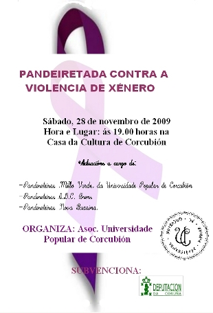 O sábado, na Casa da Cultura de Corcubión, haberá unha Pandeiretada Contra a Violencia de Xénero, ás 19.00 horas, a cargo de tres grupos de pandeireteiras da zona, concretamente de Brens (Pandeireteiras da A.D.C. Brens), Corcubión (Nova Buxaina) e as anfitrioas do evento, as pandeireteiras da Universidade Popular de Corcubión Millo Verde.