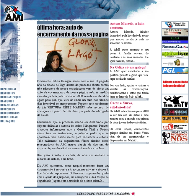 O Xulgado de Instrución número sete de Vigo ordenou o 5 de febreiro o peche da web Assembleia da Mocidade Independentista (AMI) e a retirada do vídeo de debuxos animados Vilingüismo, onde se conta a historia dunha vila galega que é invadida por un grupo de alieníxenas que queren terminar co galego e impoñer o castelán.