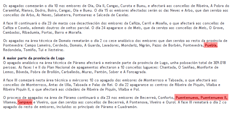 Cando aínda non rematou a polémica sobre o "Desván de los Monjes", a Xunta volve demostrar o seu desleixo pola toponimia nunha nota de prensa publicada o mesmo luns pola tarde na súa páxina oficial. Nun anuncio dos próximos apagamentos analóxicos, faise alusión á desconexión dos centros de "Puebla", "Puentenuevo", "Puentenuevo II" ou "Sanpayo".