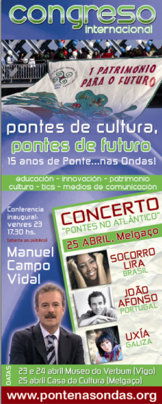 Cúmprense este ano quince anos de actividade a pé das escolas do colectivo Ponte nas Ondas, e aproveitando o aniversario, especialistas de varios países foron convidados ao congreso internacional 'Pontes de Cultura, Pontes de Futuro', que terá lugar no Verbum, en Vigo, os días 23 e 24 de abril, e concluirá o 25 de abril do outro lado do Miño, en Melgaço. E a potencialidade do patrimonio cultural inmaterial galego-portugués como motor da Eurorrexión Galiza-Norte de Portugal será xustamente un dos eixos sobre os que reflexionen os expertos aló reunidos.