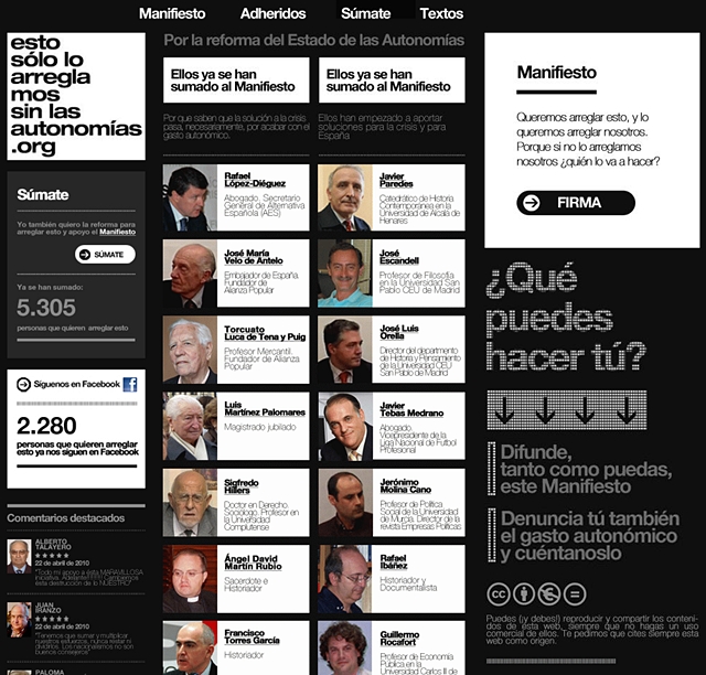 "Las 'autonosuyas' son el cáncer que puede acabar con España" ou "No quiero autonomías, es un gasto loco, sin control, y encima lo pagamos con nuestro trabajo y nuestro dinero" son algúns dos comentarios dos asinantes do manifesto Esto sólo lo arreglamos sin las autonomías, que se está dando a coñecer desde hai uns días entre os medios de comunicación de todo o Estado.