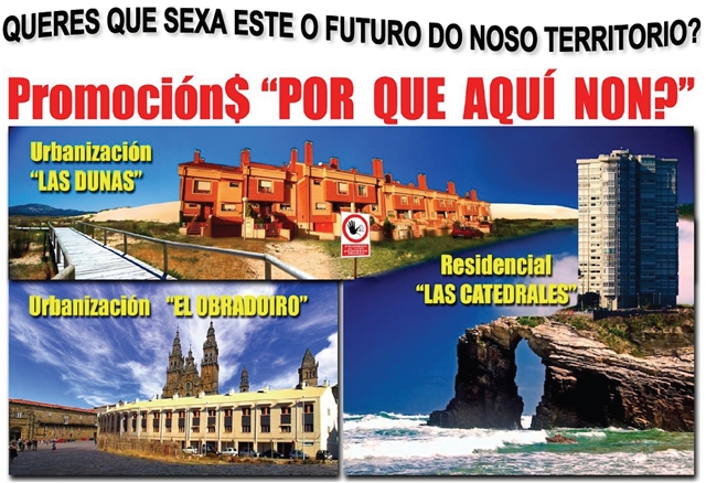 Baixo o lema O noso territorio, a nosa identidade pretenden denunciar a través dunha performance as consecuencias do urbanismo depredador e das políticas insustentábeis de ordenación territorial, escenificando a venda dunhas promocións urbanísticas en lugares emblemáticos do país.