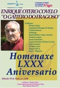 Henrique Otero, o Gaiteiro do Fragoso, recibirá este sábado unha merecida homenaxe en Vigo. O Conservatorio Superior de Música de Vigo, coa colaboración da Asociación de Gaiteiros Galegos (AGG) celebra ás seis da tarde un acto para recoñecerlle a súa traxectoria a quen xa é un dos principais mestres da gaita da segunda metade do século XX en Galiza, un personaxe clave para comprender e coñecer o mundo deste instrumento e imprescindíbel para Vigo e a súa comarca.