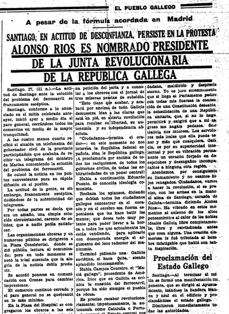 "Al terminar el mitin se formó una manifestación imponente, que se dirigió al Ayuntamiento, izándose la bandera blanca y azul en el edificio y proclamándose el estado gallego. Dimitieron inmediatamente todas las autoridades. El pueblo pidió clamorosamente que Alonso Ríos ocupase la presidencia de la Junta Revolucionaria y, entonces, dijo éste que era del pueblo y que antes de ceder pasarían sobre su cadáver".