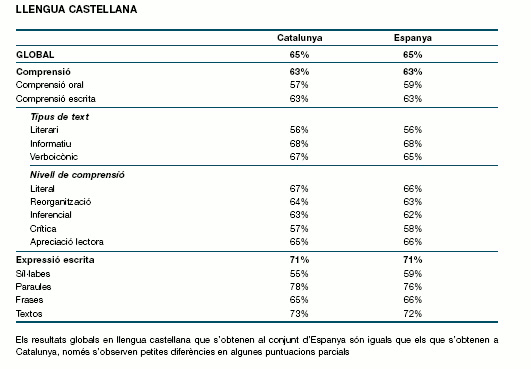 O dominio do castelán no conxunto de España non difire globalmente do de Cataluña, onde o ensino é todo en catalá agás a clase de lingua castelá, se ben hai pequenas diferenzas nos ítems.