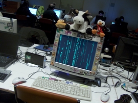 Vaca, pingüín e especie sen identificar, gardando a cancela deste decorado monitor. Exemplo das moitas mascotas na ciberfesta.