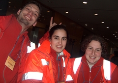 Un internauta que pillou un dedo nunha porta e un xornalista máis experto coa tecla que con coitelo e garfo, tamén mancado nun dedo, únicas incidencias médicas nas primeiras 24 horas. "Hoxe se cadra hai algún desmaio", agoiran os servizos de urxencia. Na foto: Carlos, Mónica e Teresa.