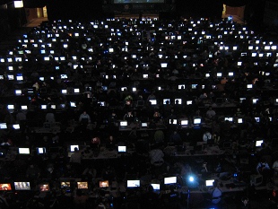 Xa roda a pleno pulmón cibernético a principal romaría do país. Cruzando a media tarde, os últimos en chegar buscaron asento entre o mar de computadores. Máis de 1.800 ciber-romeiros. Estamos todos? Que comece a festa!