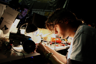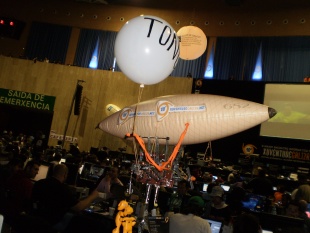 Ademais do evidente apartado lúdico, tamén se pode ver nesta Xuventude Galiza Net xente traballando duramente, como este rapaz, que está a darlle os últimos retoques ao seu robot para participar nas competicións que se desenvolverán paralelamente ás carreiras de Fórmula 1. Si, outra vez a Fórmula 1.